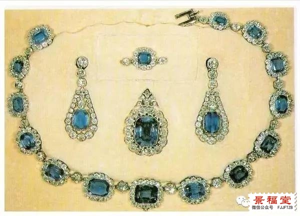 1947年11月,当时还是公主的伊丽莎白与菲利普·蒙巴顿王子大婚。父亲乔治六世送给爱女的结婚礼物是一套诞生于1850年的蓝宝石首饰,包括项链、耳环、胸针和戒指。算起来,即便在当时这也已是百年古董~看照片,非常精美有木有?