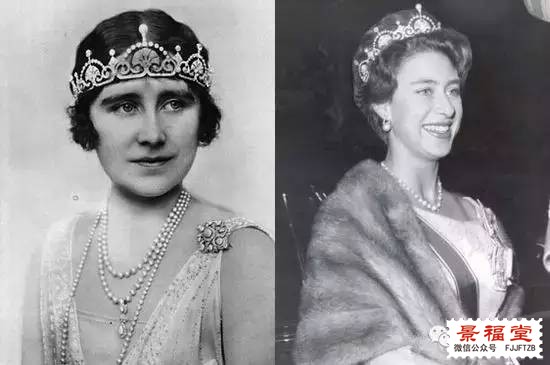 左边是女王的妈妈也就是王太后1930年佩戴这款头冠,爵士时代流行靠下佩戴。右侧则是女王的妹妹玛格丽特公主,照片摄于一次宴会。
