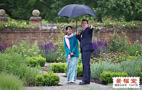 之前昂山素季老师访英的时候,卡梅伦也是在这里接待了她,虽然期间为了表现自己的绅士风度主动为女士撑伞,结果伞破了,有点尴尬:
