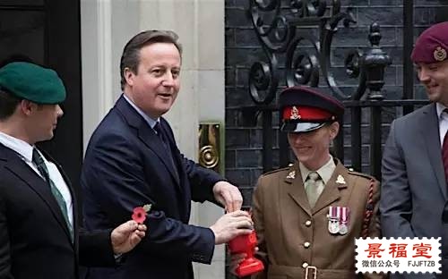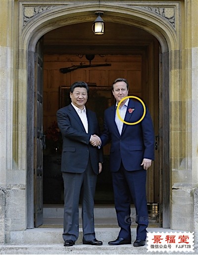 所以22日早上,卡梅伦在首相官邸唐宁街,花10英镑从退伍老兵手中购买了今年第一朵小红花,然后顺手佩戴上去,才有了下午我们在习近平和卡梅伦会面时看到的那一幕: