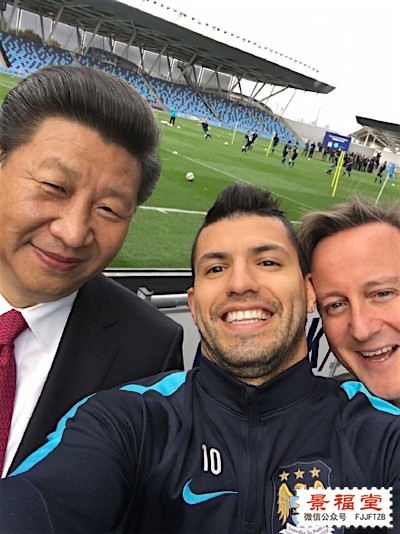 最后,曼城球星阿圭罗在自己的微博发布了一张跟卡梅伦和习近平的自拍: