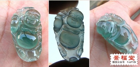 蓝玻璃欢喜佛,颜色蓝中透绿,很水的感觉。