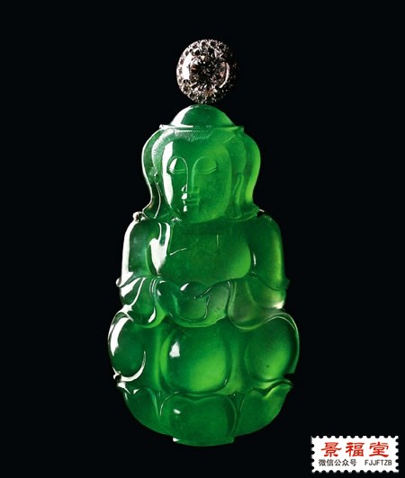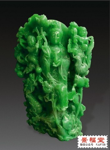 在2011的保利拍卖会中,这件满绿童子观音拍出了1.456亿元的天价。时隔一年,这件翡翠摆件再次以4.746亿拍卖成交。这件翡翠雕件的尺寸为30厘米×19厘米×11厘米,总重量为7750克。整个雕件,质地细腻,呈亚透明色,工艺也非常好,据专业部门评定,质量等级为珍品三级。拍品的雕工精细,比例匀称,线条流畅,抛光均匀洁净,体量较大,非常罕见。